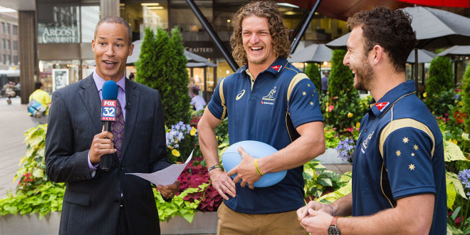 This past week, Wallabies Nick ‘The Honey Badger” Cummins and Nic White were in Chicago to promote the Wallabies September 5th match against the USA at Soldier Field in Chicago, Illinois. The match will serve as the final warm up match for both sides before they depart for the 2015 Rugby World Cup in England. The pair made promotional appearances around Chicago and also spent some time introducing the sport of rugby to a group of children.