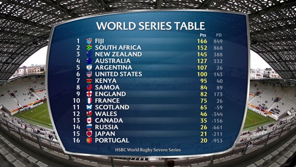 The Series now moves to its conclusion in London next weekend, with Fiji now all but certain to lift the overall crown having opened up a 14 point gap between their closest competitors South Africa. At the other end of the spectrum Portugal will have to make up six points to jump ahead of Russia and avoid being dropped from core status for the 2016/17 HSBC Sevens Series.