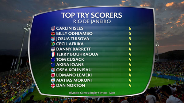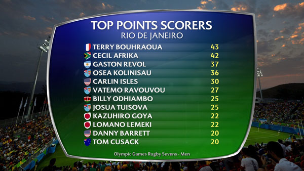 Argentina captain Gastón Revol was third highest point scorer with 37, just six below top man Terry Bouhraoua of France and five short of runner-up Cecil Afrika of the Blitzbokke. Isles was good enough for fifth spot on tries alone, with gold-medal winning skipper Osea Kolinisau creeping in just ahead of the Eagles speedster.
