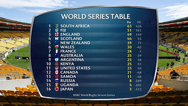 The Series resumes next weekend in Sydney, Australia, with South Africa now 12 points ahead of second place Fiji. Canada, Argentina, and the USA all sit within four points of each other.
