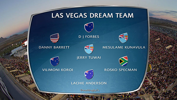 Completing the forwards are New Zealand legend DJ Forbes and big Fijian prop Mesulame Kunavula. Headlining the backs is teenage Australian sensation Lachie Anderson, who led the tournament with seven tries. A pair of Fijians – one playing for Fiji, one for New Zealand – are included in Jerry Tuwai and Vilimoni Koroi, while champions South Africa contribute only one player in the exciting Rosko Specman, star of the Cup Final.