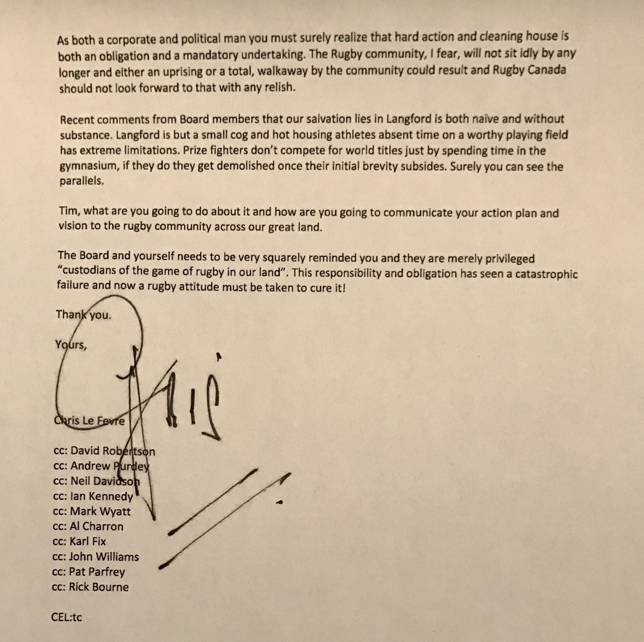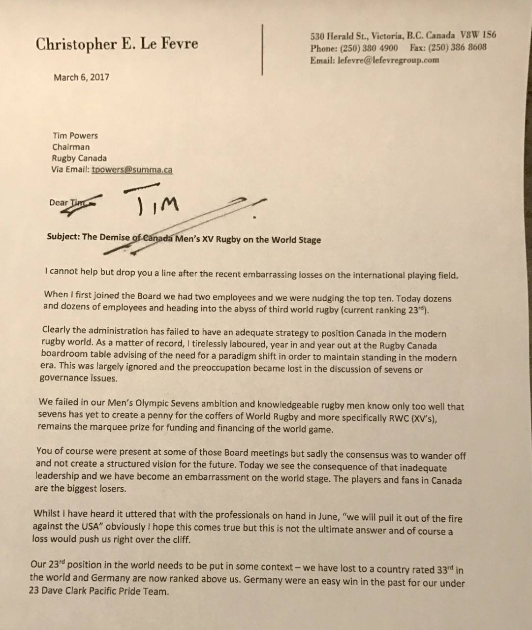 Former IRB Executive Council and Rugby Canada board member Chris LeFevre has written an open letter directed at current Rugby Canada Chairman Tim Powers. While coming in the wake of the poor results during the Americas Rugby Championship, the letter is heavily critical of the management and direction of Rugby Canada and calls for immediate action.