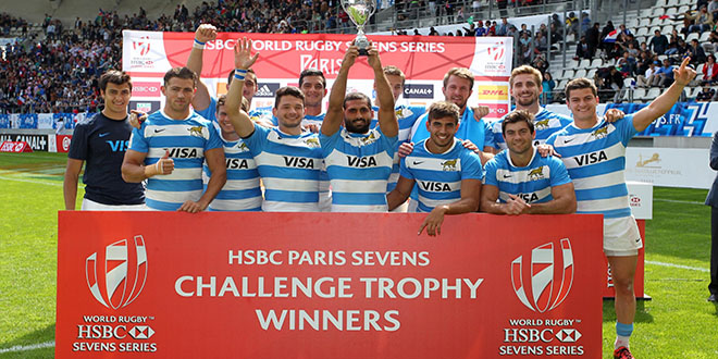 Argentina overcame their disappointing opening day to win all three matches on Day Two of the Paris 7s and come away as Consolation Trophy winners. To do so they had to navigate tricky waters. Captain Gastón Revol save the day in the Trophy Quarter Final with a late try lifting the team past Kenya.