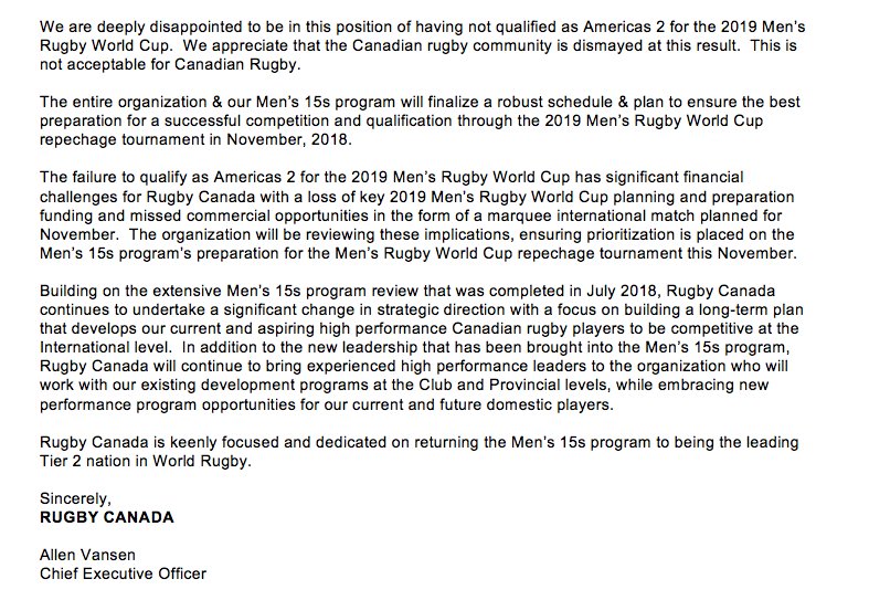 In his statement Vansen refers to Rugby Canada’s restructuring in 2017 following a comprehensive program review. The changes saw both Senior Men’s Head Coach Mark Anscombe and General Manager Jim Dixon depart the organization.