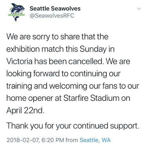 Major League Rugby has hit its first speed bump. Late Wednesday evening its Seattle franchise, the Seawolves, were forced to pull out of a scheduled preseason match against the Vancouver Island Crimson Tide. The match was due to take place at Westhills Stadium in Langford, BC, on Sunday afternoon. A social media update confirmed the decision though the post has since been removed.