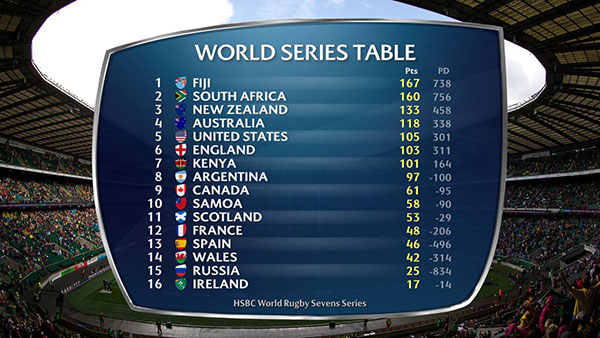 The 2017-18 Series concludes in Paris next weekend. South Africa are the only team capable of catching Fiji, who now enjoy a seven-point buffer at the top of the table. The USA will need to be at their best to hold off England and Kenya in the race for 5th place overall. Argentina have slumped to 8th, while Canada are all-but-certain of a Top 10 finish though Samoa are in hot pursuit for their current 9th place position.