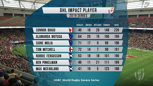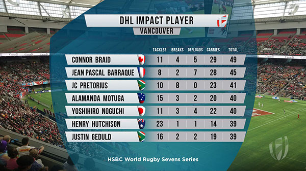 Connor Braid has done it again. For a second consecutive tournament the Canadian dynamo outstripped the field to win the DHL Impact Player of the Vancouver Sevens. The award is given at each stop of the HSBC Sevens Series to the player who scores the highest cumulative number of tackles, line breaks, offloads, and carries.