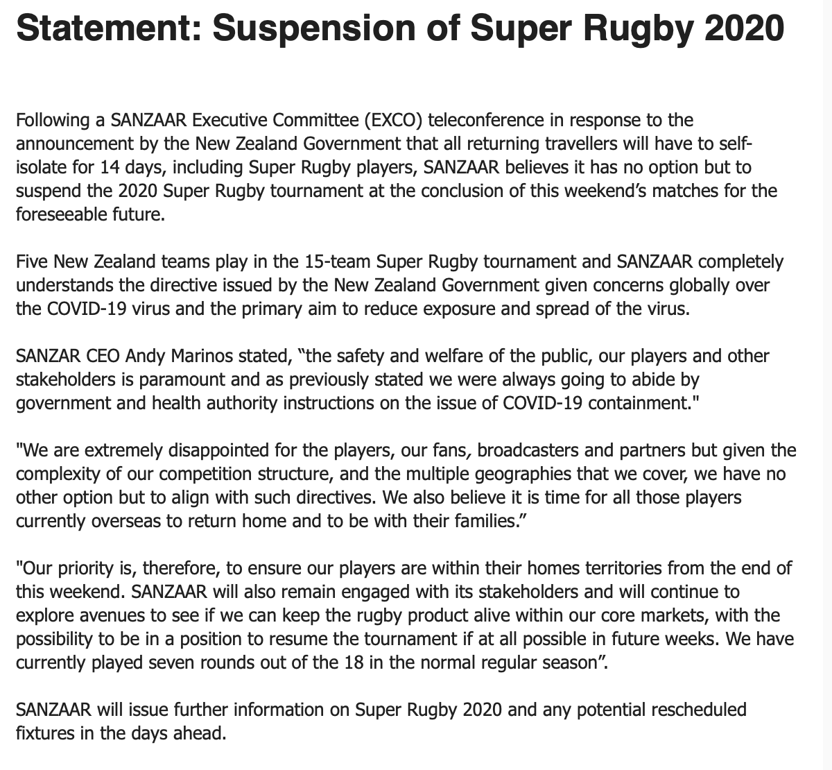 Jaguares vs Highlanders will go ahead this evening as scheduled. The round seven Super Rugby match is to the final confirmed match of the 2020 Super Rugby season. A decision over remaining matches will be made in due course.