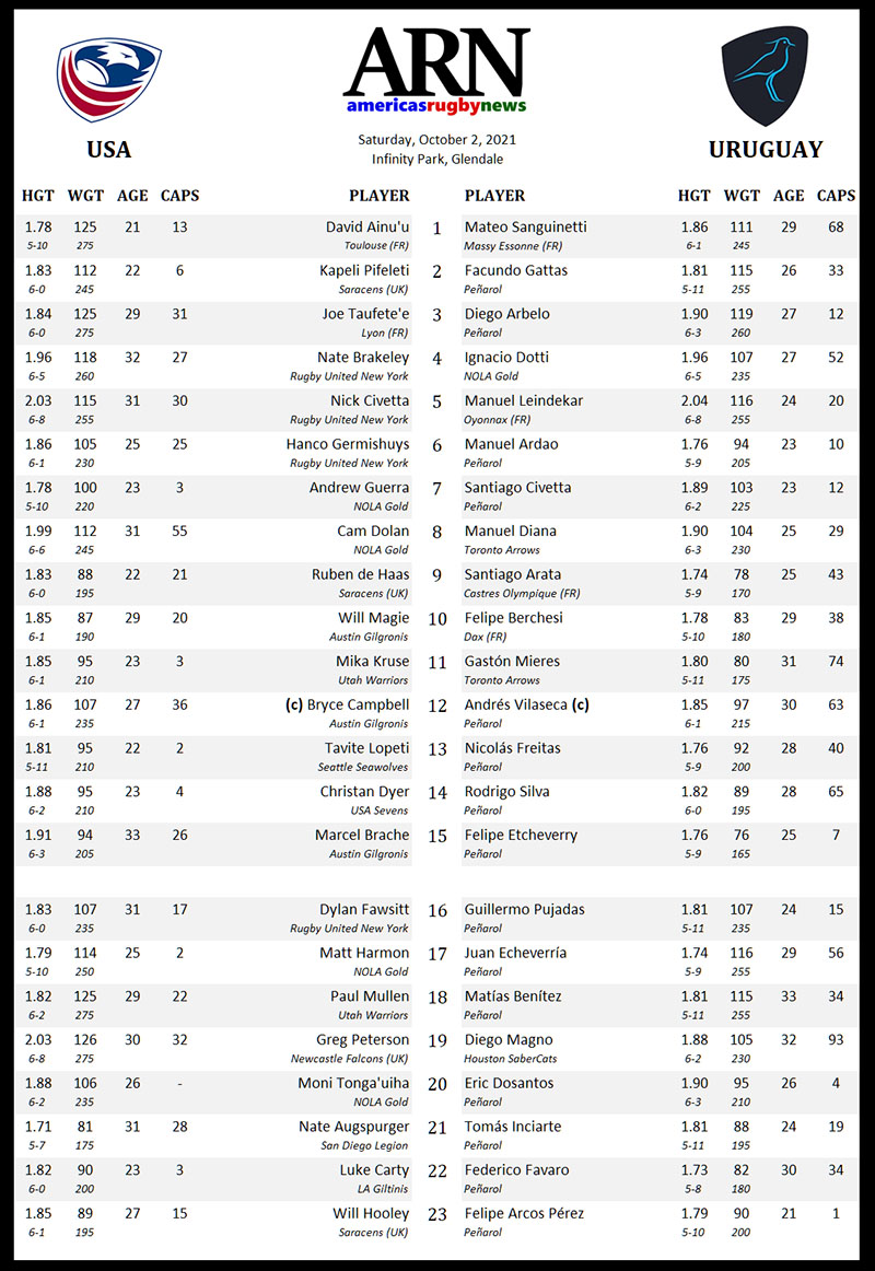 Both teams are effectively comprised entirely of professionals with the Eagles drawing from Major League Rugby and Los Teros heavily leaning on SLAR franchise Peñarol. The set piece will be an intriguing battle, though one point of difference for the USA looks to be the ball carrying ability of their France-based front row trio of David Ainu’u, Kapeli Pifeleti, and Joe Taufete’e.