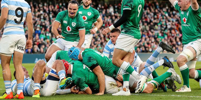 Straight hands put Ireland in behind the Argentine defense from a scrum on halfway. Another penalty conceded an attacking lineout and while this time the maul was repelled, the Irish forwards thumped ahead until Andrew Porter crashed through under the posts for an easy seven.
